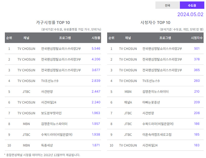 종합편성 (5/2) [전국] 시청률 (닐슨코리아)