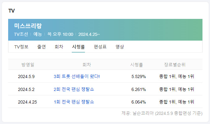 미스쓰리랑 시청률 (1회) 미스트롯3 진선미 정서주 배아현 오유진 탑7 대결 마스터 김연우 진성 김연자 출연 (0) | 2024.04.29 |