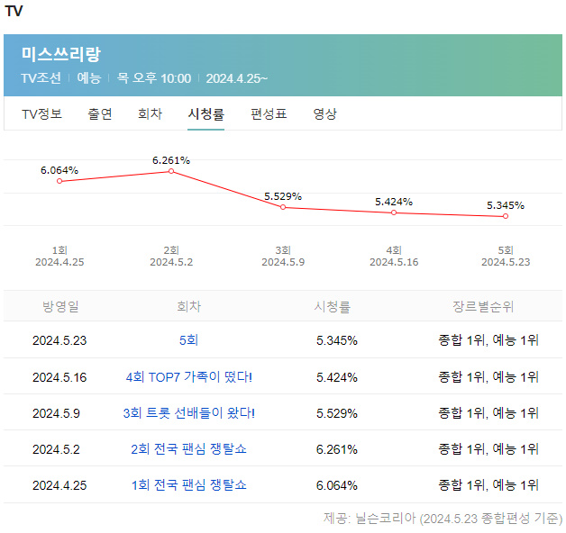 미스쓰리랑 5회 시청률 5.345% (닐슨코리아-5월23일)