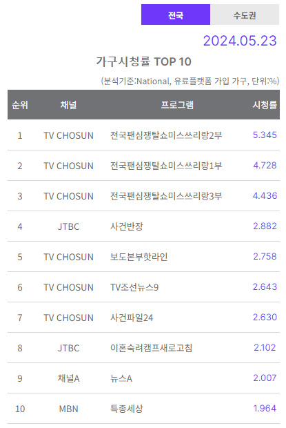 미스쓰리랑 시청률 6회 출연자 배우 문희경 배우 서지석 은가은 진욱 '지역 홍보대사' 특집 (0) | 2024.05.28 |