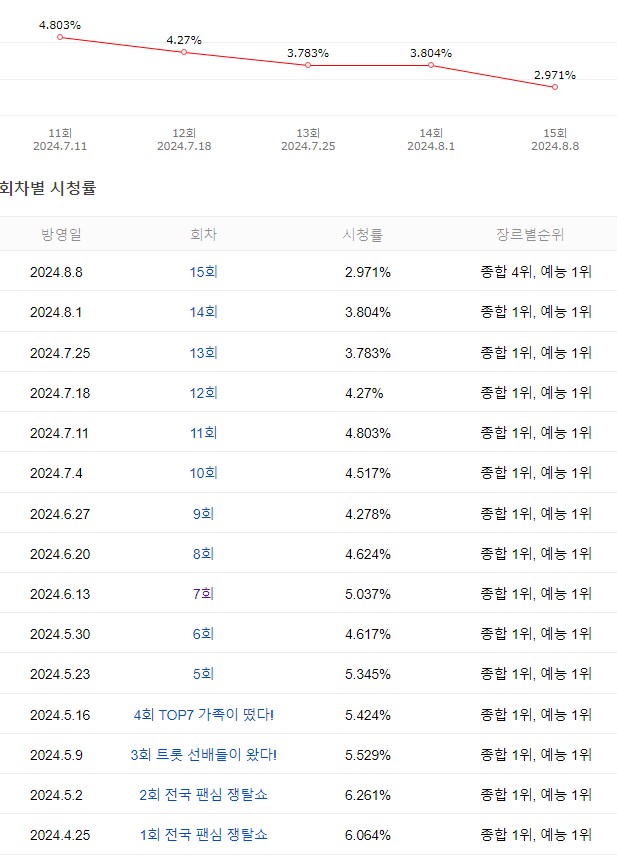 미스쓰리랑 15회 시청률 2.971% (닐슨코리아 8월8일 방송)