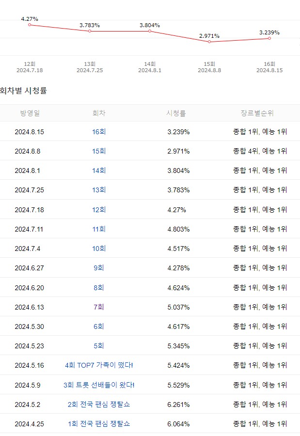 미스쓰리랑 15회 시청률 출연자 박완규 박군 황민호 (0) | 2024.08.05 |